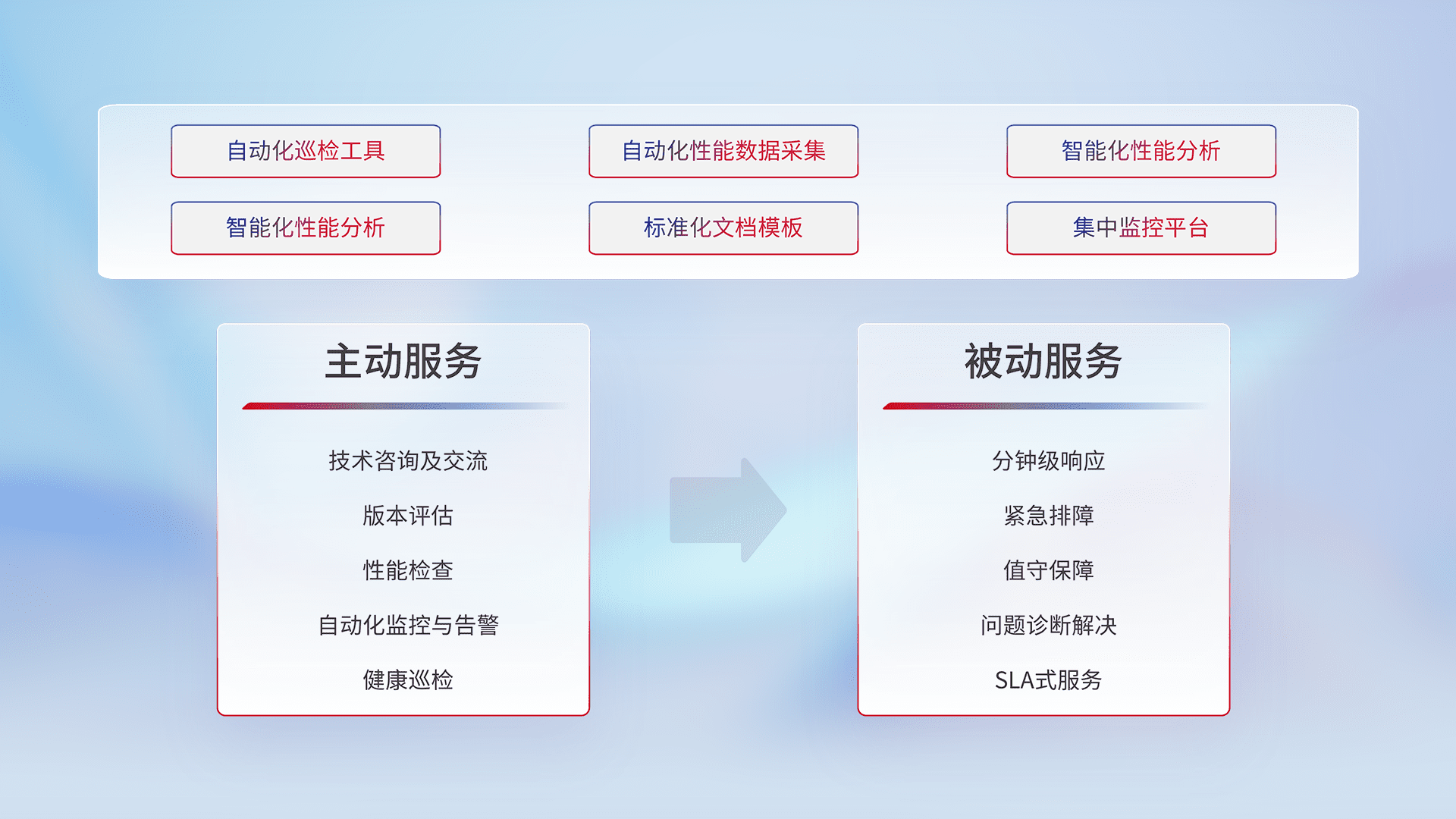 智能化工具和标准化文档,,保障服务质量,,提供主动服务(包含技术咨询、、、版本评估、、性能检查、、自动化监控与告警、、健康巡检)和被动服务包含(分钟级响应、、紧急排障、、值守保障、、、、问题诊断解决、、、SLA服务)。。。