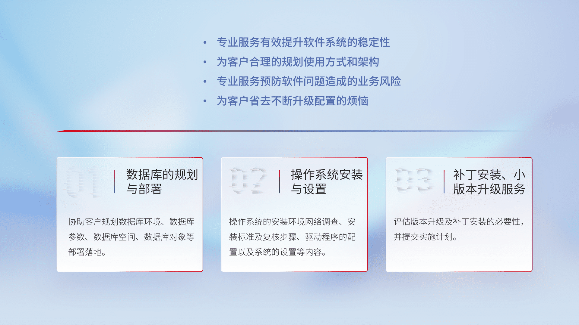 为客户提供软件规模升级、、快速部署、、按需配置的专业服务,,,,从数据库的规划与部署到操作系统的安装与设置,,,再到补丁安装和小版本升级提供支持。。