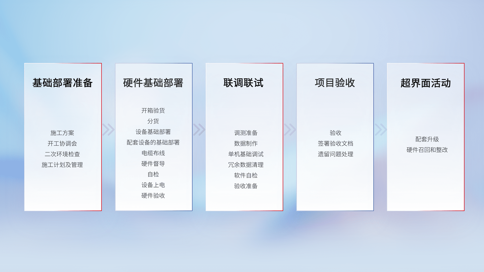 从基础部署准备、、硬件基础部署、、、联调联试、、、、项目验收、、、、越界面活动的全过程可追溯,,,,保证施工质量和进度。。